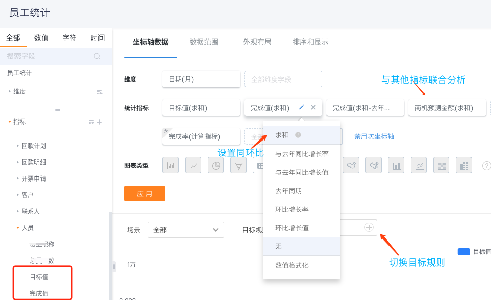通过「员工主题」新建的目标统计图,可以实现目标值、完成值与其他指标联合分析的需求
