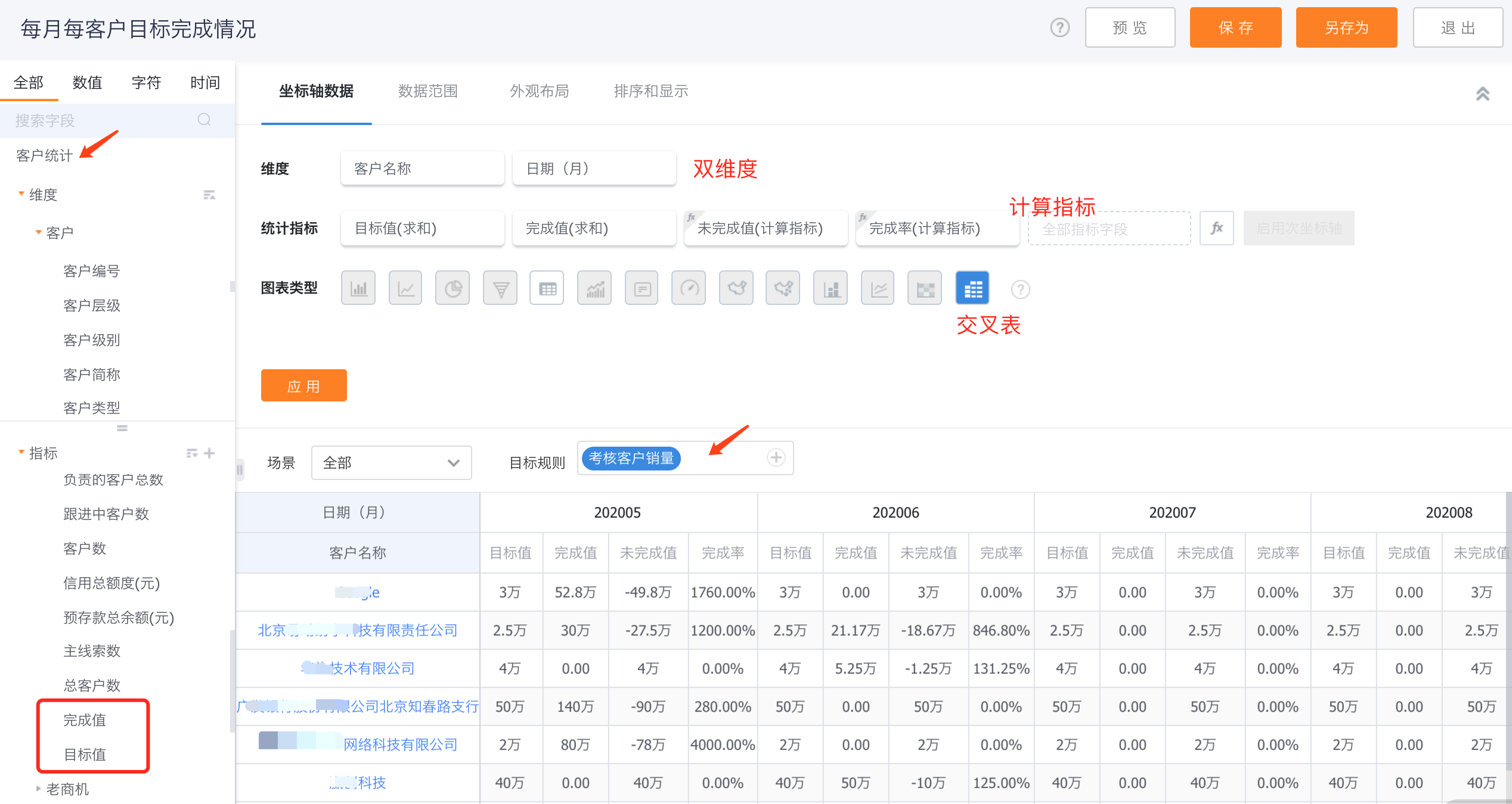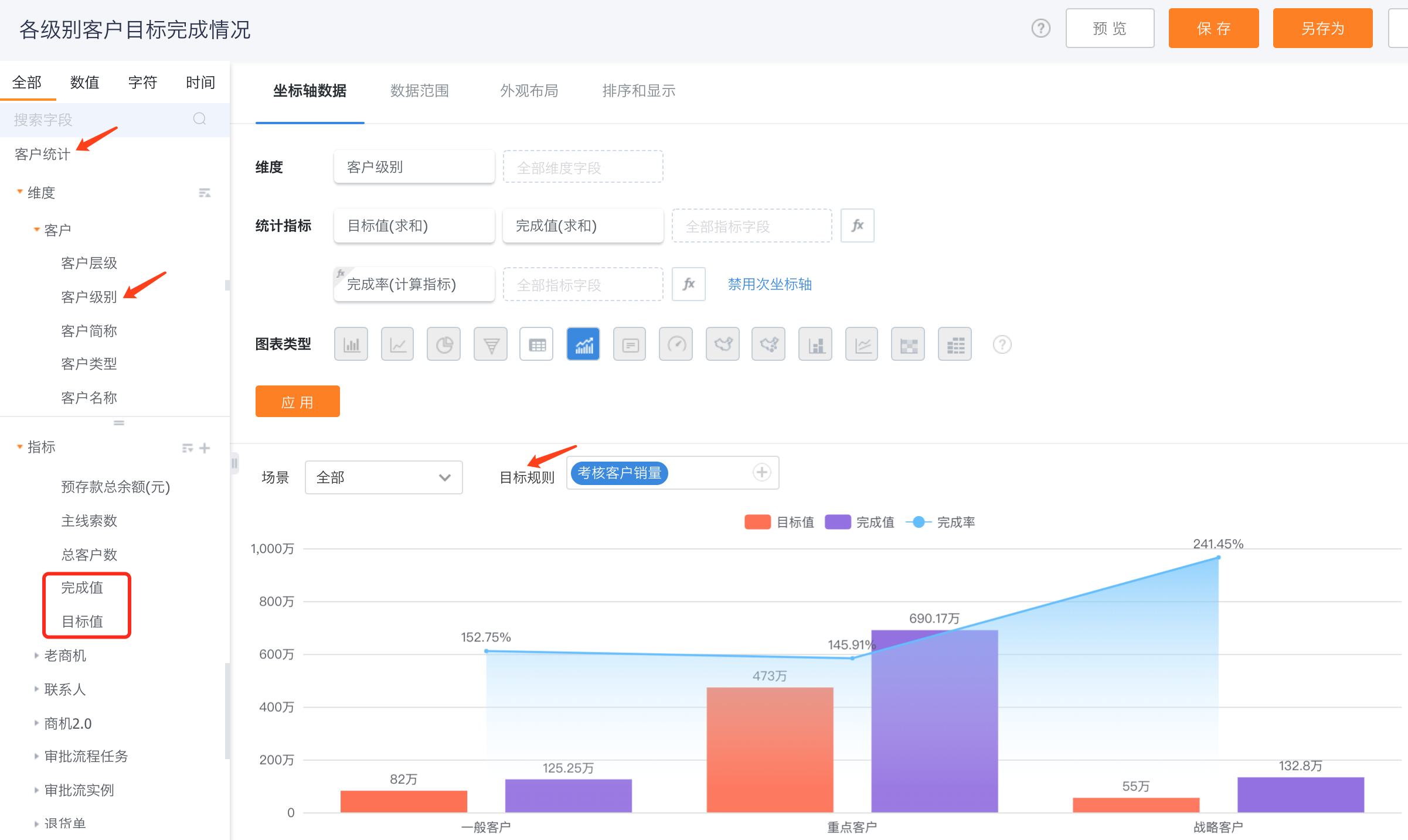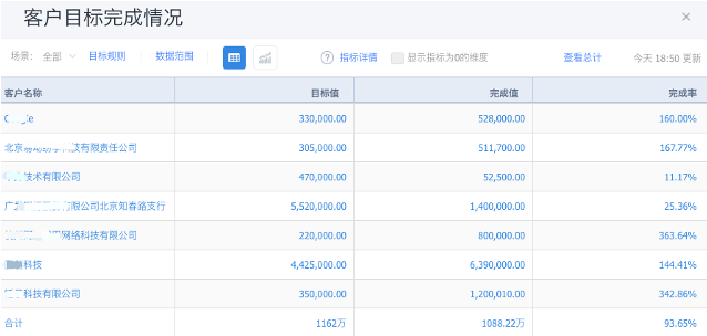 - 目标值:通过「主属部门」查询到客户,进而查询到客户上设定的目标值的和;