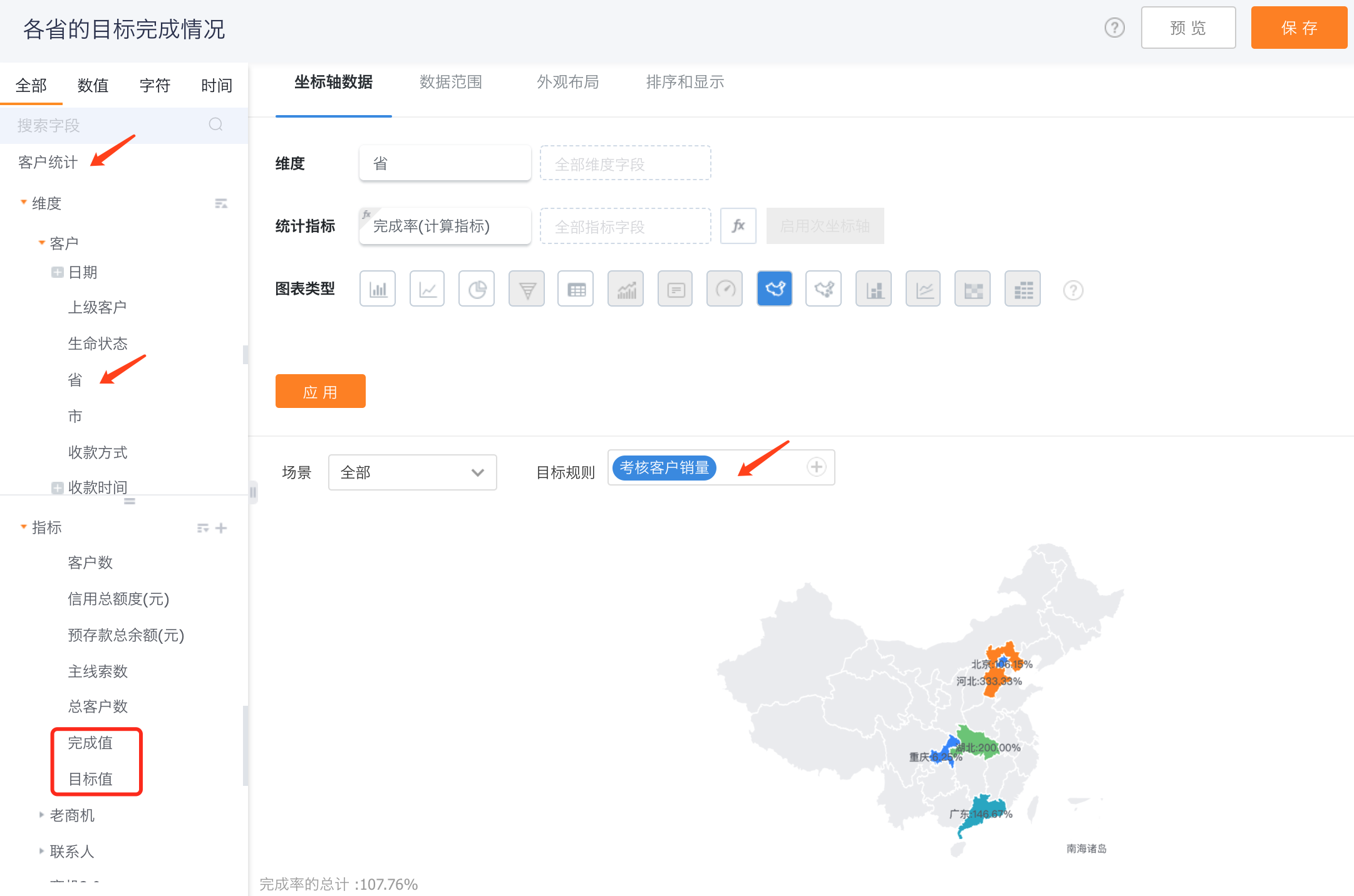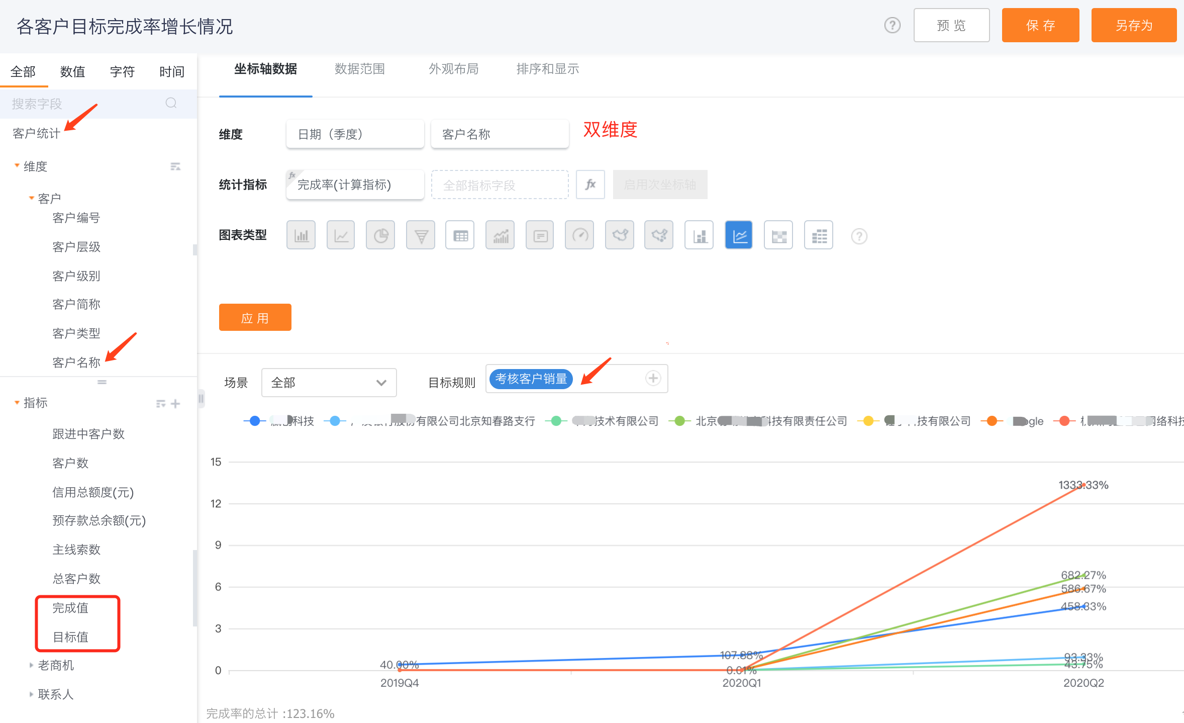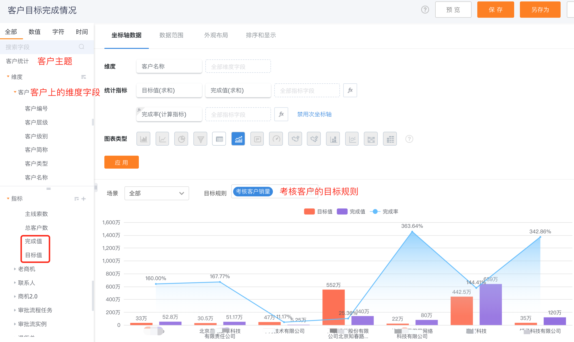 - 完成值:通过「主属部门」查询到客户,进而查询到客户对应的完成值的和;