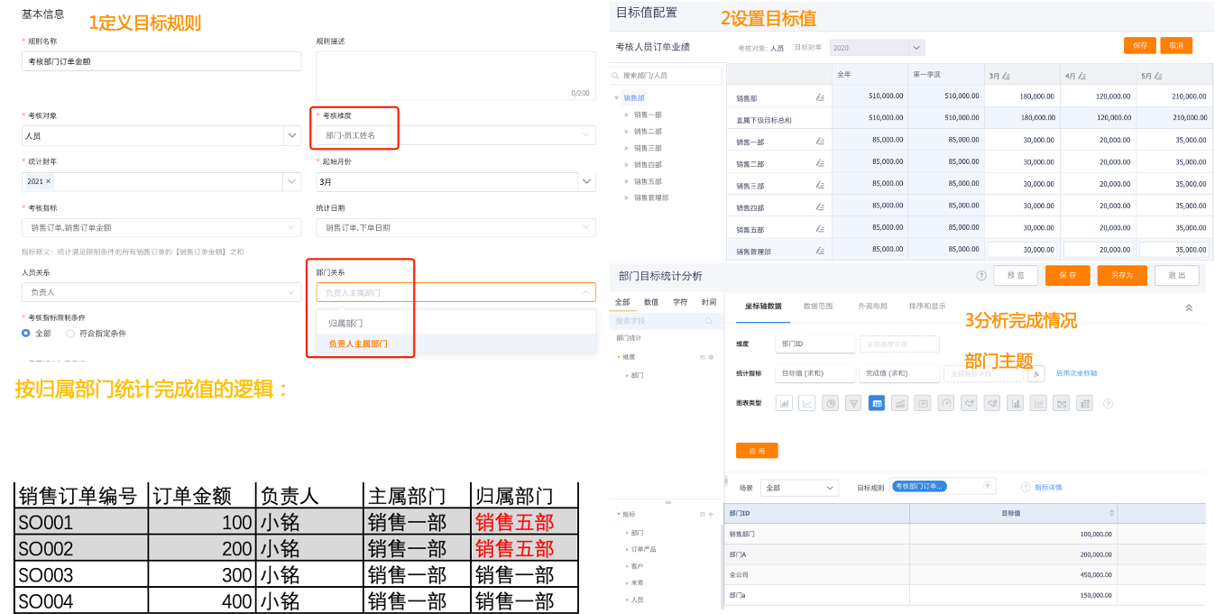 如果需要按数据归属部门分析部门达成,需要通过【部门主题】分析,并且在配置目标规则时,部门关系选择「归属部门」;