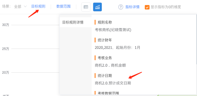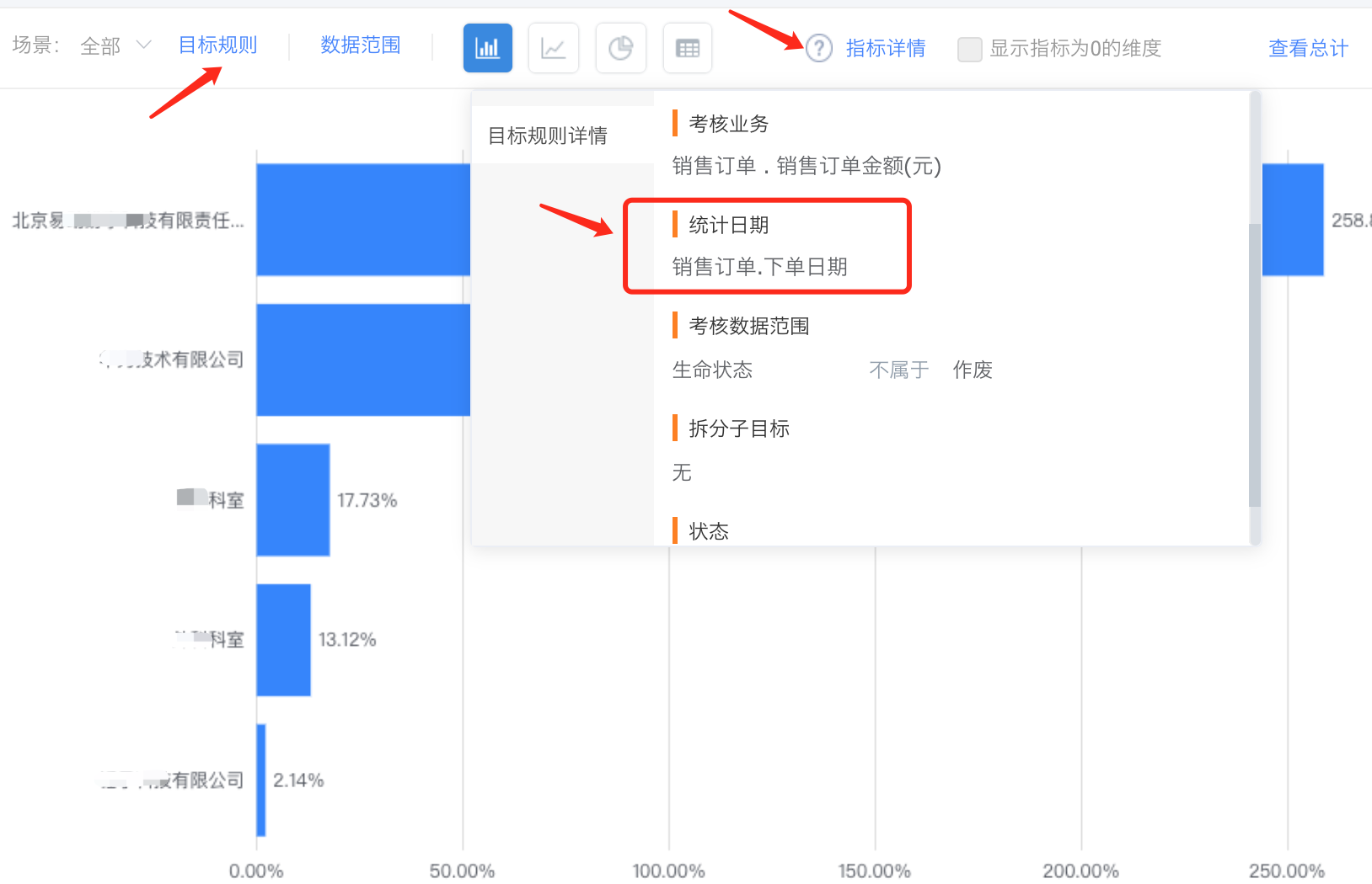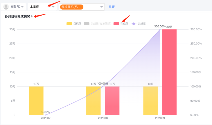 - 目标值:取的是设置在部门上的目标值;当选择多个部门的时候,就是这多个部门上设置的目标值的和;