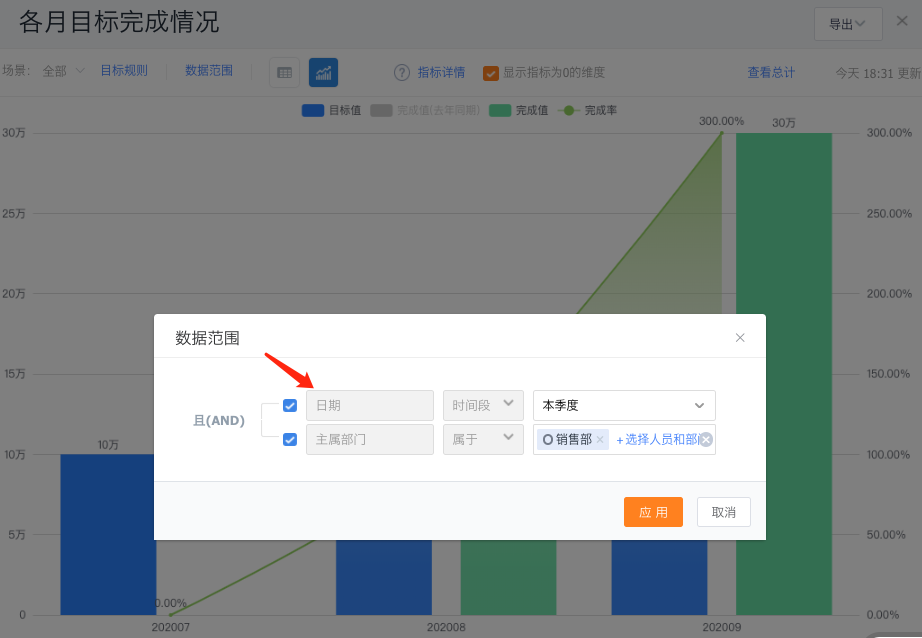 - 日期对于统计图中完成值的筛选含义:全局筛选的日期,会传入到统计图数据范围里的「日期」字段,此日期字段实际筛选的含义就是「完成值」对应的目标规则定义里选择的「统计日期」字段