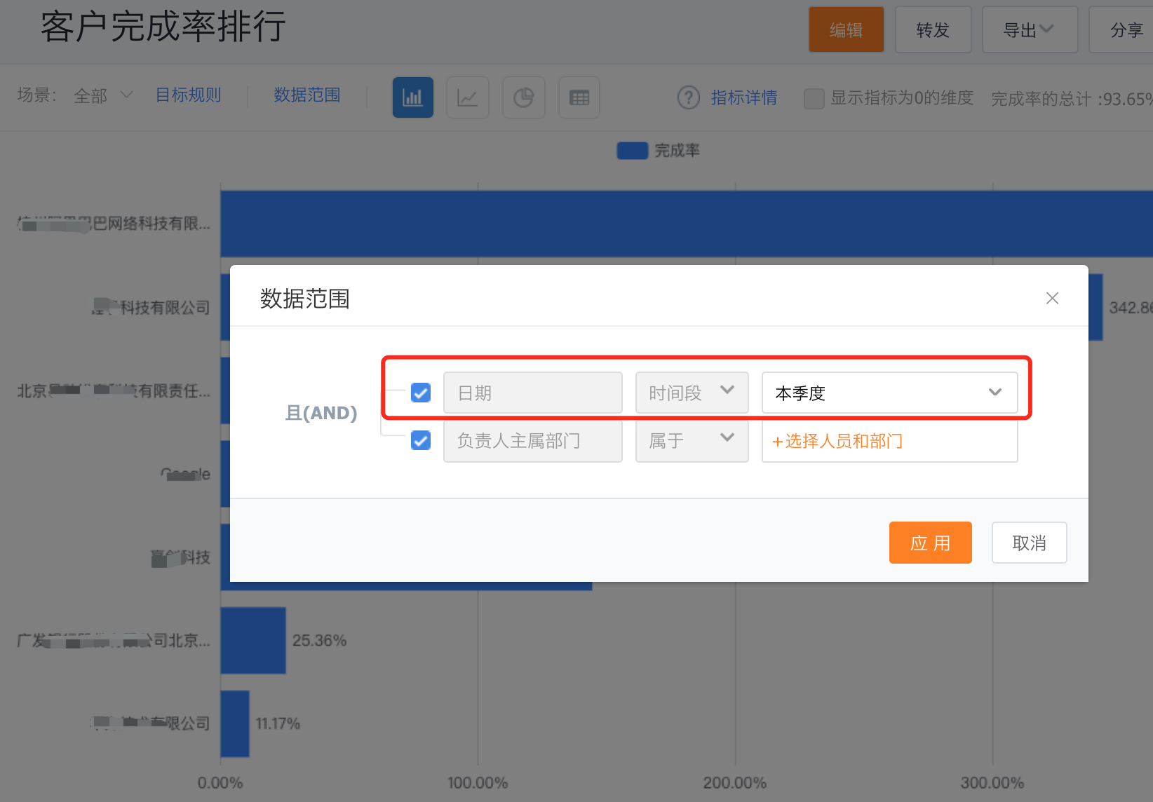 - 举例子:如下图,全局筛选选择「本季度」,传值给驾驶舱里的统计图【客户完成率排行】数据范围里的日期,这个日期对于完成值的筛选含义,可以通过「指标详情」查看,此例中为「销售订单.下单日期」,也就是 完成值 查询的是 下单日期 在本季度 的销售订单 的订单金额求和。