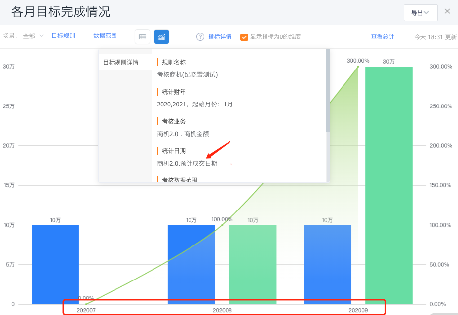 - 当时间筛选为自定义时间段,目标值取包含的所有月份,比如:2018-9-28至2018-12-5,则目标值取包含9、10、11、12月的目标值之和
