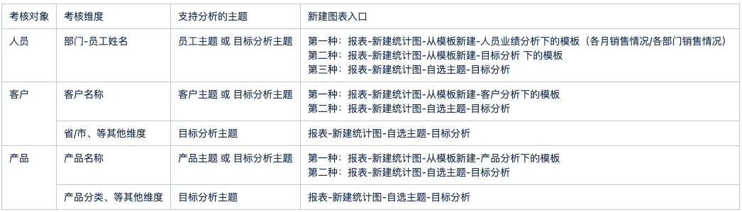 - 区别在于:1、图表权限走对应主题权限;2、目标分析主题下仅可分析目标值、完成值指标;人员、客户、产品主题下可以将目标值、完成值与其他指标联合分析;