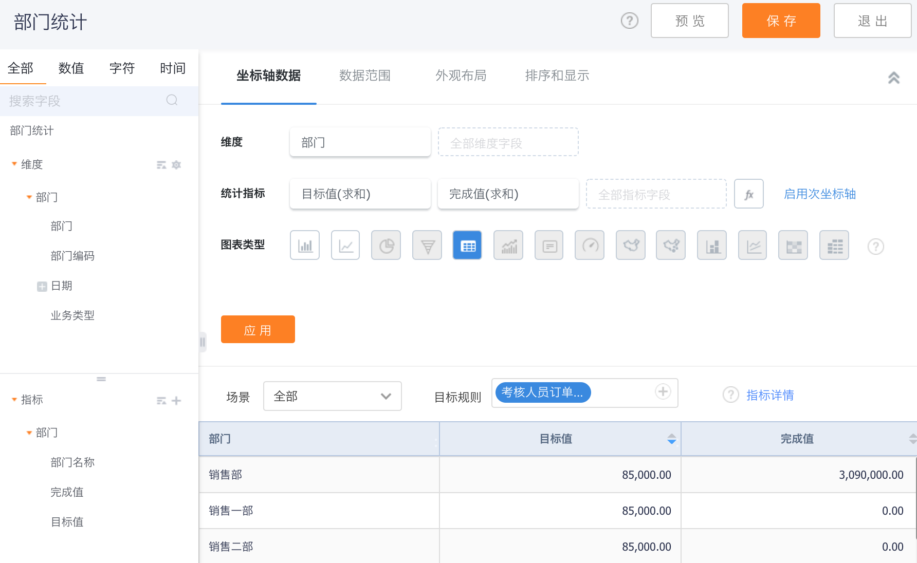 通过「部门主题」配置目标统计图,可实现按数据归属部门分析部门目标达成。